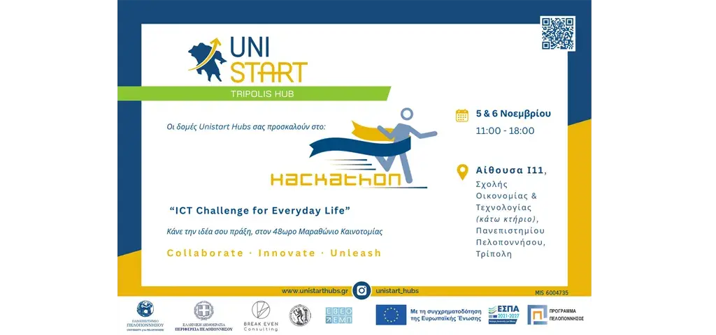 Τα UniStart Hubs (Δομές Επιχειρηματικότητας και Καινοτομίας του Πανεπιστημίου Πελοποννήσου και της Περιφέρειας Πελοποννήσου) σας προσκαλούν στο διήμερο hackathon ICT Challenge for Everyday Life, που διοργανώνεται σε συνεργασία με τη Σχολή Οικονομίας και Τεχνολογίας του Πανεπιστημίου Πελοποννήσου.