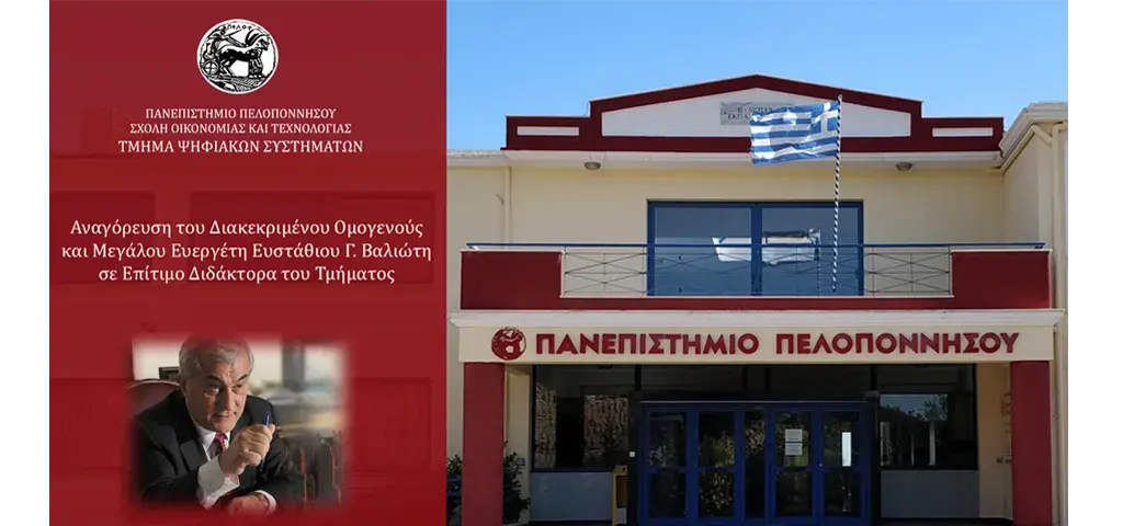 Το Πανεπιστήμιο Πελοποννήσου ανακοινώνει με ιδιαίτερη τιμή την τελετή αναγόρευσης του Διακεκριμένου Ομογενούς και Μεγάλου Ευεργέτη, κ. Ευστάθιου Γ. Βαλιώτη, σε Επίτιμο Διδάκτορα του Τμήματος Ψηφιακών Συστημάτων της Σχολής Οικονομίας και Τεχνολογίας.